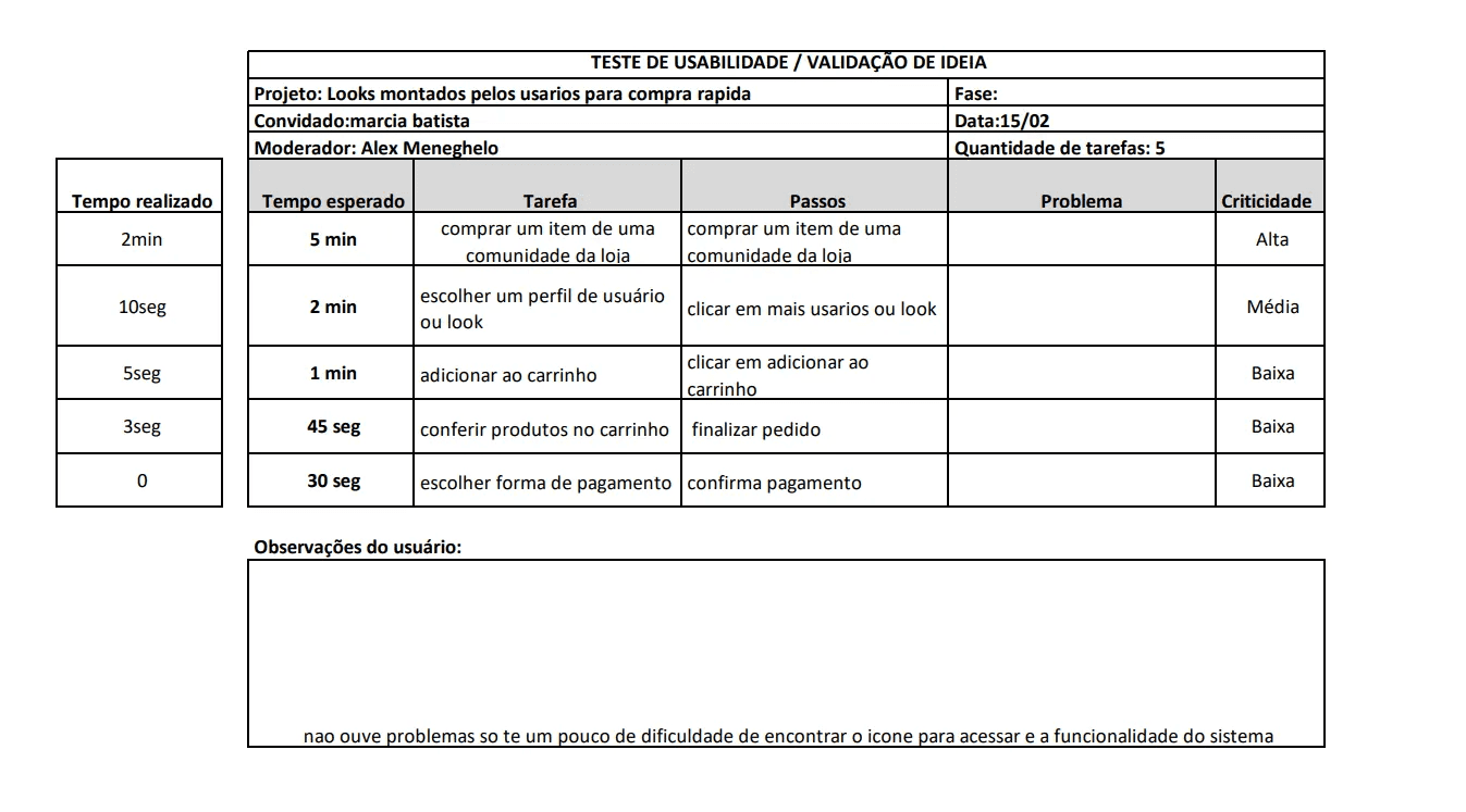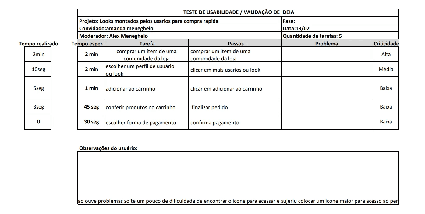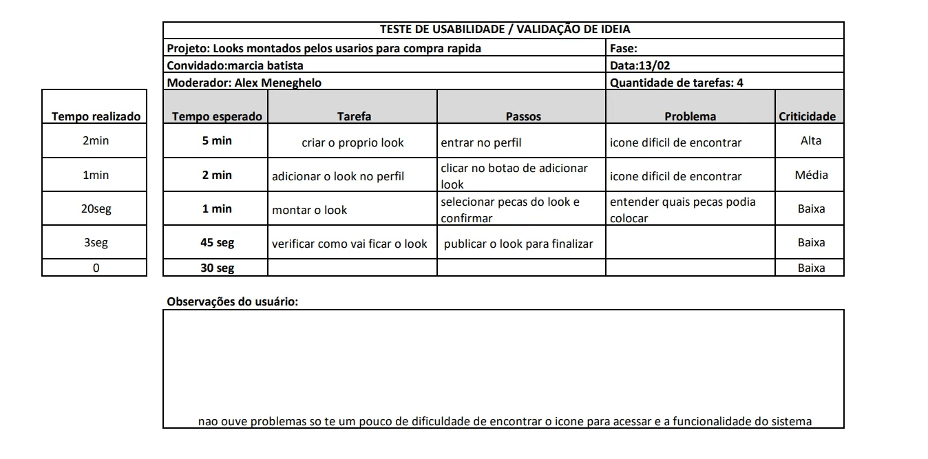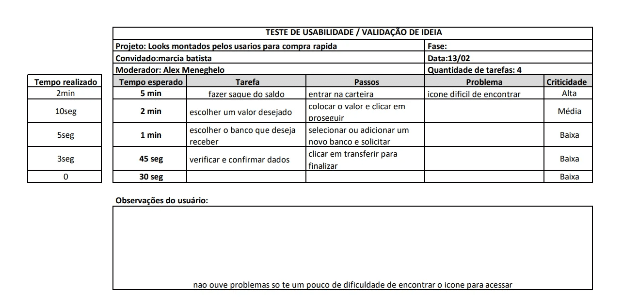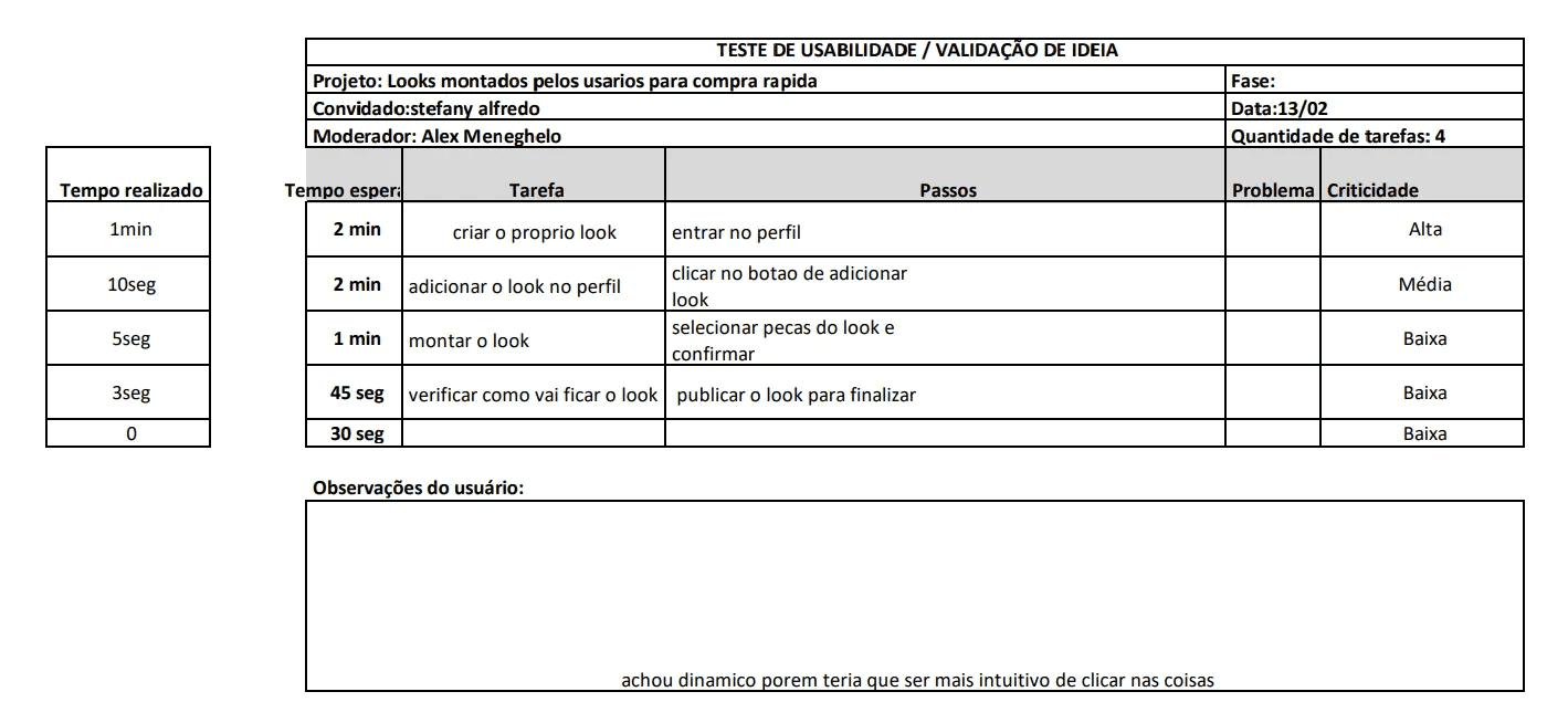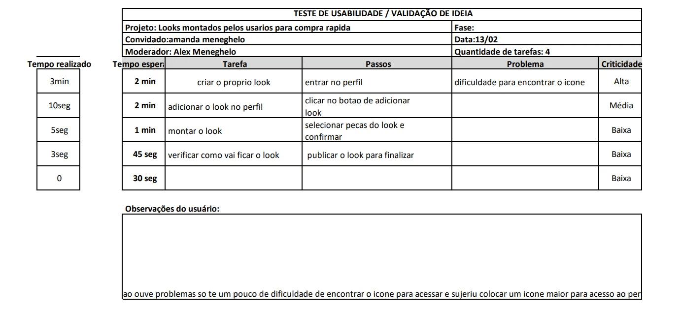 Ícones precisam ser repensados: Como a crítica apareceu em todas as entrevistas, há uma validação clara de que o design dos ícones (perfil, carteira, adicionar look) deve ser mais destacado, maior e com rótulos/textos de apoio.