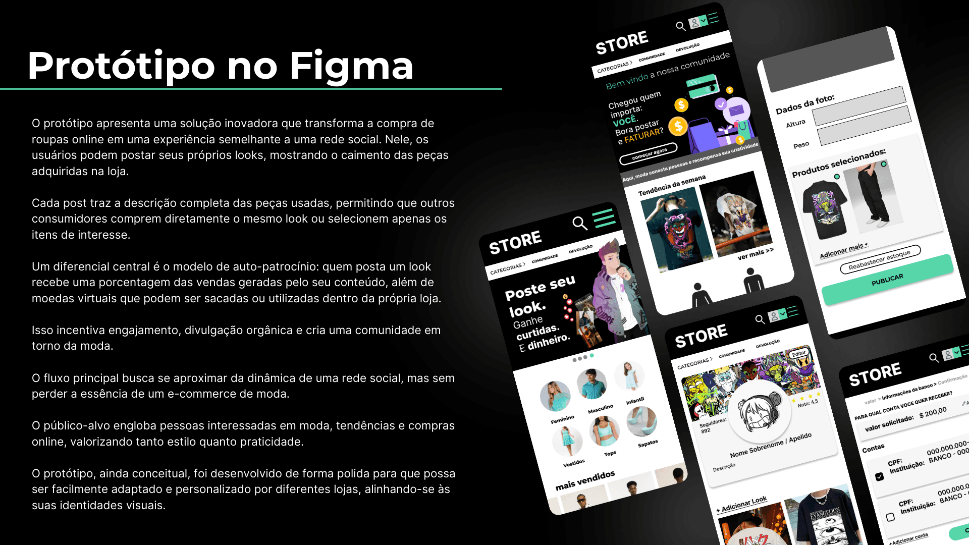 Como resultado final, foi desenvolvido um protótipo funcional que demonstra fluxos claros e intuitivos para compra, criação de looks e saque de recompensas, equilibrando simplicidade e engajamento.