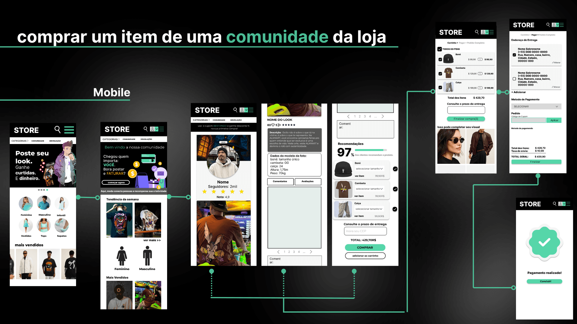 Comprar um item da comunidade da loja, o caminho segue o padrão esperado de um e-commerce tradicional (banner → produto → carrinho → checkout → pagamento), garantindo familiaridade e reduzindo barreiras de decisão. A diferença está em integrar esse processo dentro de uma experiência social, onde o usuário pode ver o caimento real das peças em outras pessoas. Isso aumenta a confiança, gera identificação e reduz indecisões na compra.