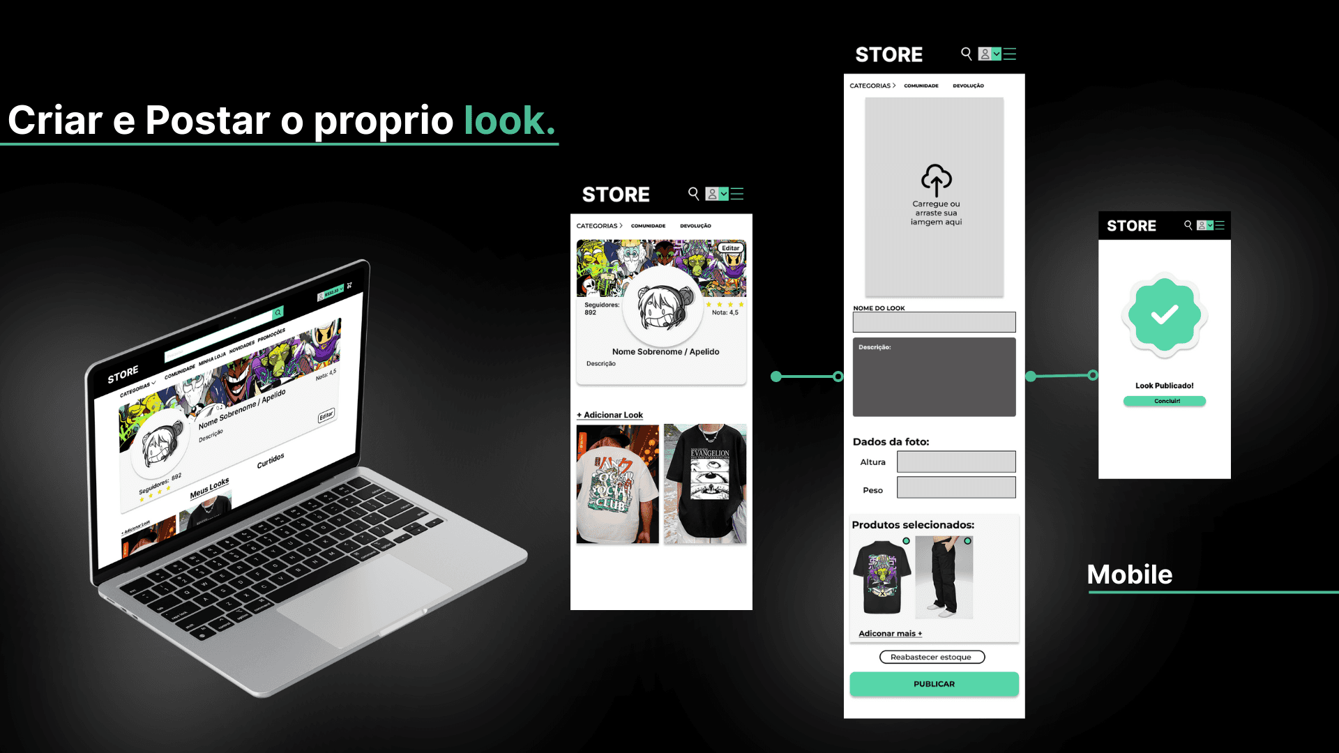 Criar o próprio look, o fluxo foi construído de forma direta: acessar o perfil, montar combinações de peças, salvar e publicar. Esse processo curto elimina barreiras para a participação ativa, incentivando a criação recorrente de conteúdo, gerando senso de comunidade e transformando cada usuário em um potencial divulgador da loja, o que fortalece o engajamento orgânico.