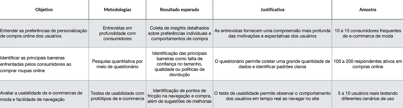 Aqui, o objetivo foi identificar as principais barreiras enfrentadas pelos consumidores na compra online de roupas. O questionário permitiu coletar uma amostra maior de respostas, trazendo dados que ajudam a identificar padrões claros sobre dúvidas e inseguranças comuns, como tamanhos, qualidade do produto e políticas de devolução.